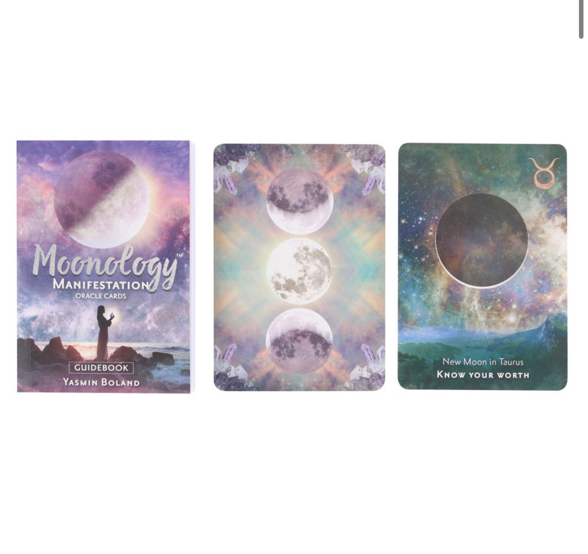 The Moonology Manifestation Oracle card deck by Yasmin Boland includes a 48-card deck and 144 page guidebook. This deck allows the user to easily manifest their dreams using the power of the moon. Beautifully presented and illustrated by Lori Menna.
