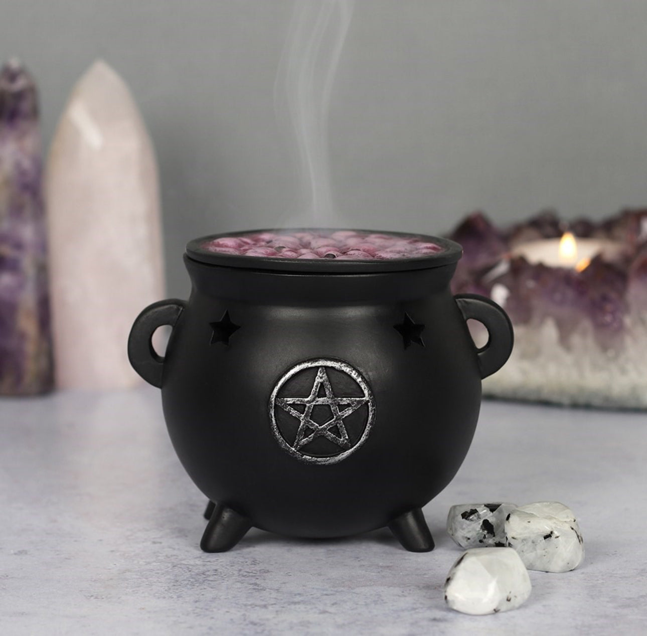 Place an incense cone inside of this resin pentagram cauldron burner and watch the smoke gently rise from the top. Accented by cutout stars and a distressed silver-effect triple pentagram design, with a removable 'bubbling' brew top.