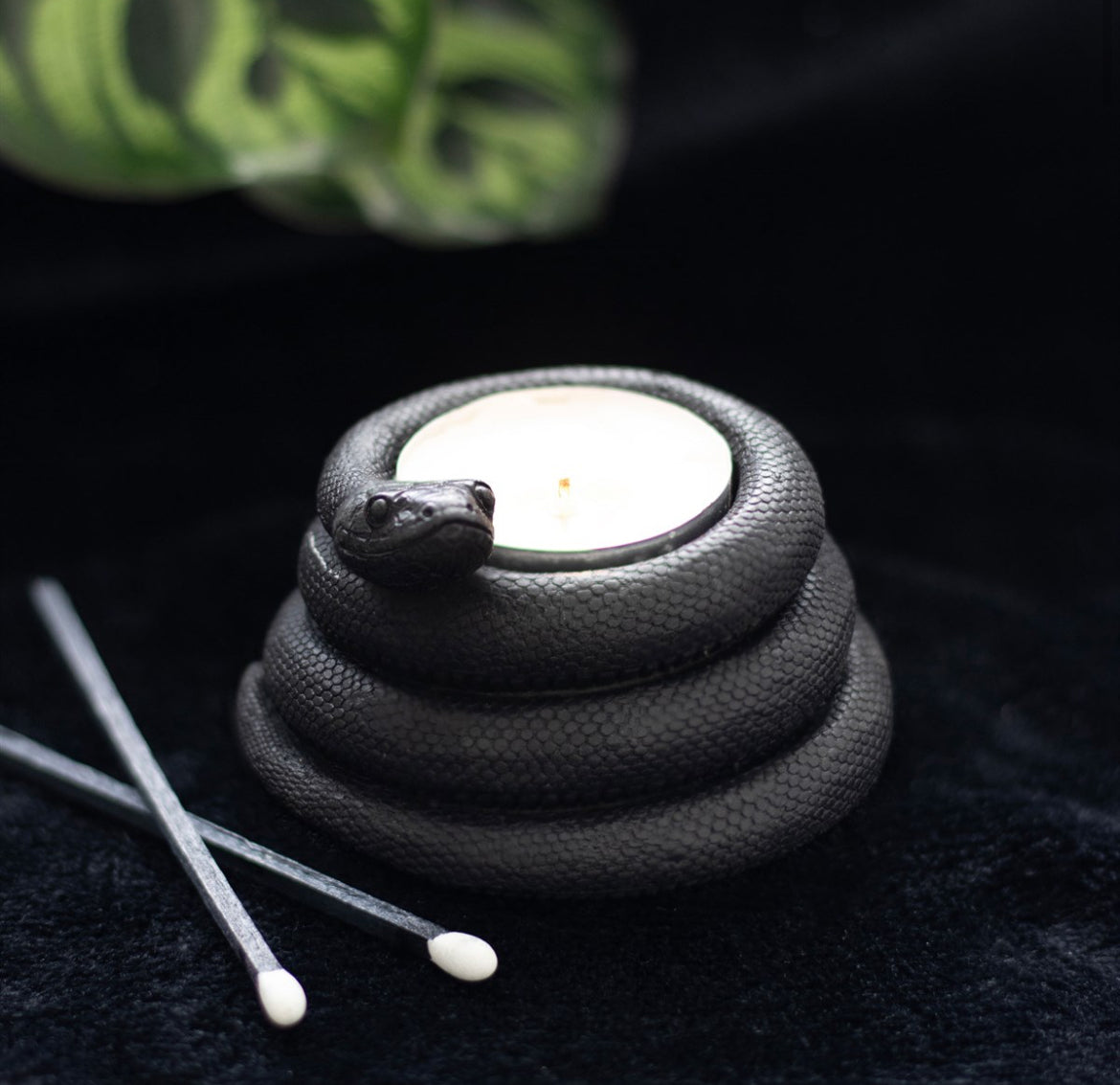 Perfect for adding intrigue and creepy vibes to home decor. Made of resin, this sleek black tealight holder features a coiled snake design and accommodates a standard single tealight for casting captivating shadows and creating a mesmerizing ambiance. Ideal for enhancing both modern and eclectic interior spaces.