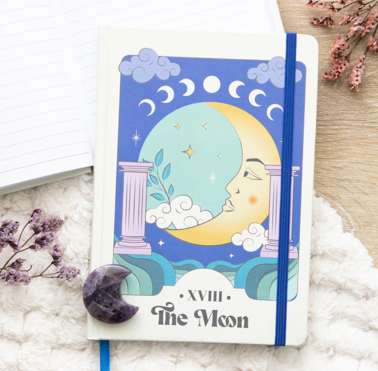 This stunning celestial-themed A5 notebook features a colourful design inspired by 'The Moon' tarot cards. Includes lined paper pages perfect for jotting down notes, sketches, or creative ideas while adding a touch of comic elegance to a workspace.