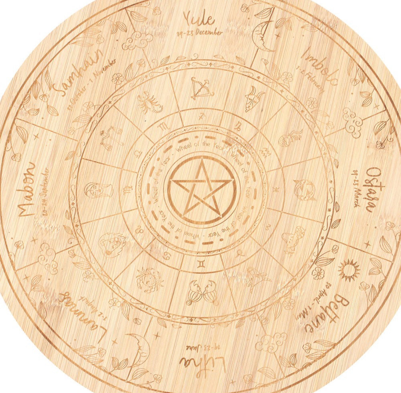 Bring a seasonal touch to gatherings and ritual feasts with this wooden serving board engraved with the Wheel of the Year. Featuring symbols for all eight sabbats, it's both a functional kitchen piece and a meaningful spiritual accent. Hand wash only. Do not soak.